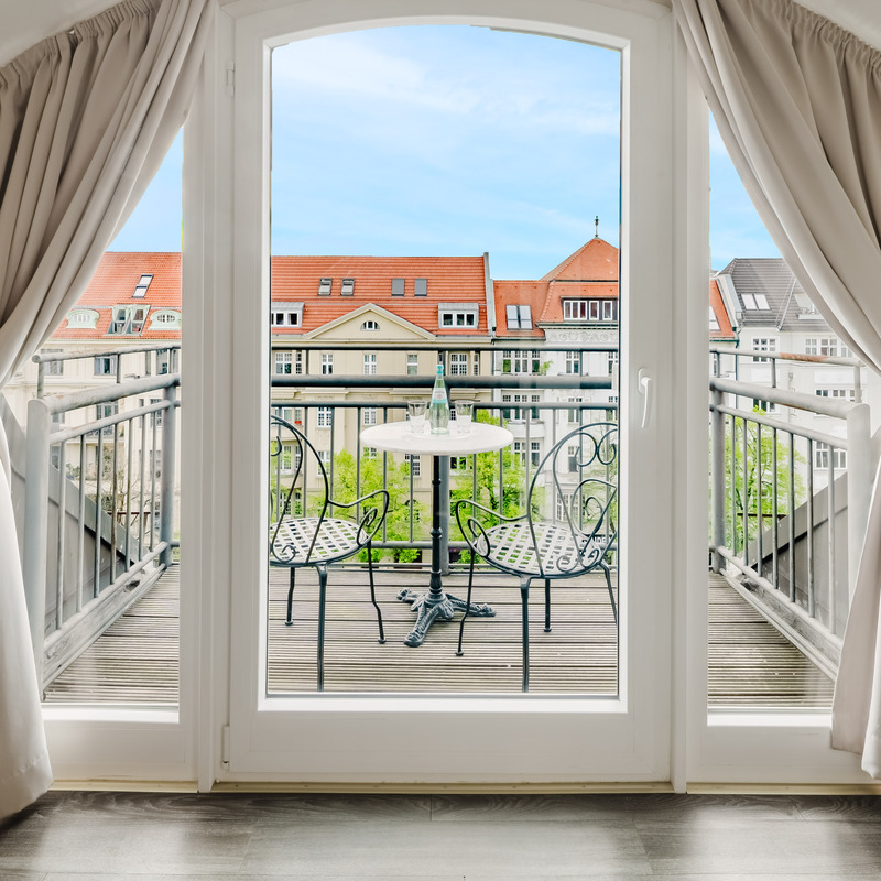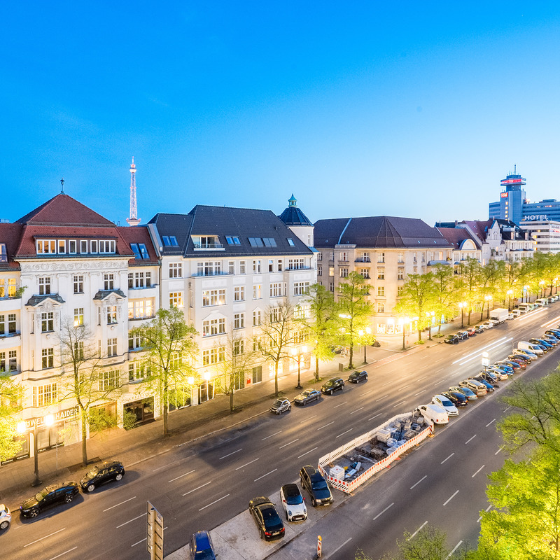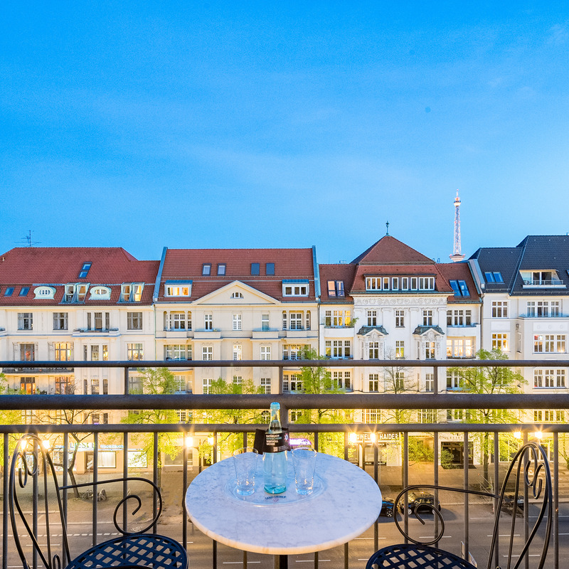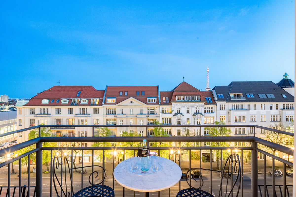 Von der 5. Etage aus geht es über das Treppenhaus oder über eine schmale Treppe auf eine Empore. Vom Balkon der Junior Suite (Zimmer 62) schweift der Blick über Berlin zum Funkturm und bei guter Sicht zum Roten Rathaus im Osten der Stadt.