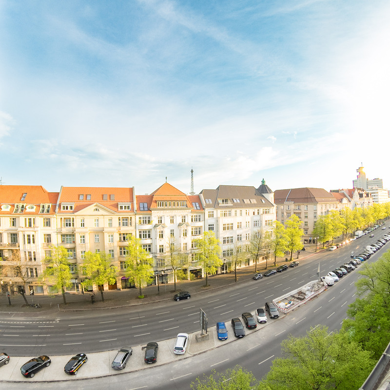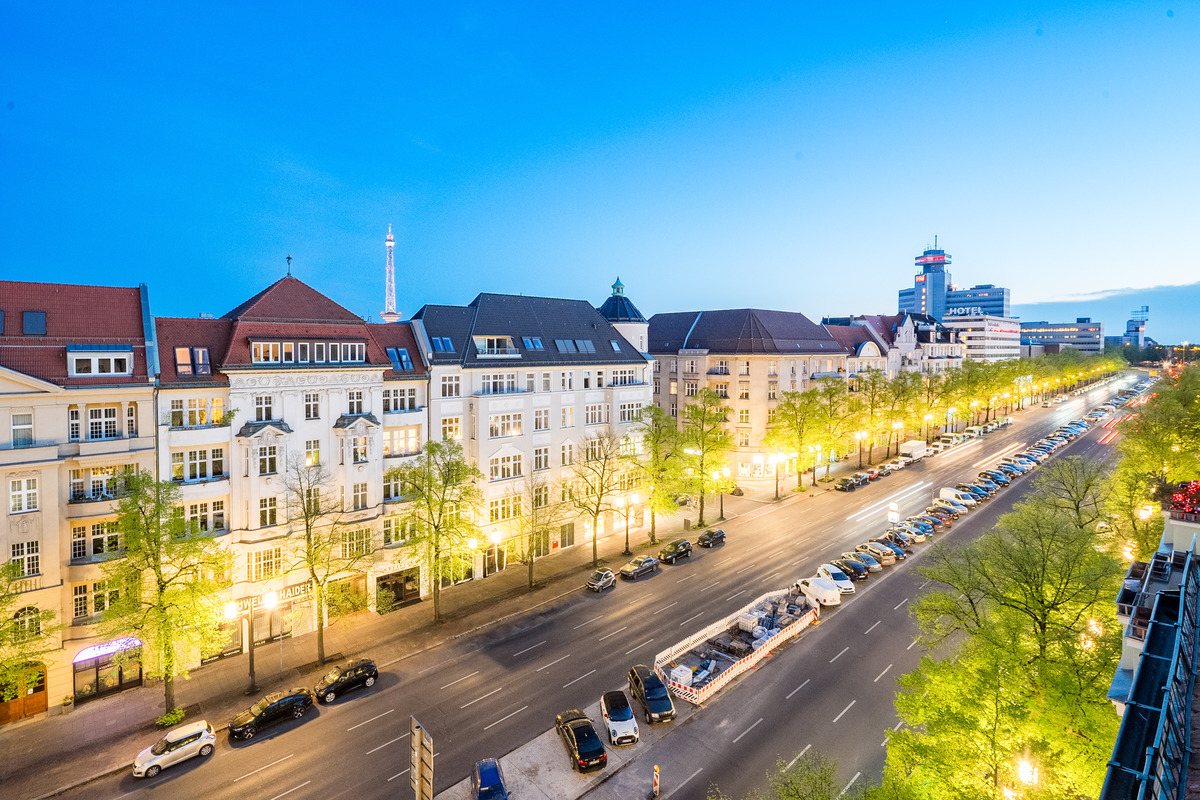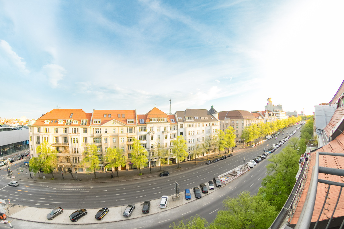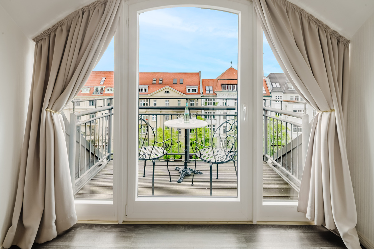 Von der 5. Etage aus geht es über das Treppenhaus oder über eine schmale Treppe auf eine Empore. Vom Balkon der Junior Suite (Zimmer 62) schweift der Blick über Berlin zum Funkturm und bei guter Sicht zum Roten Rathaus im Osten der Stadt.