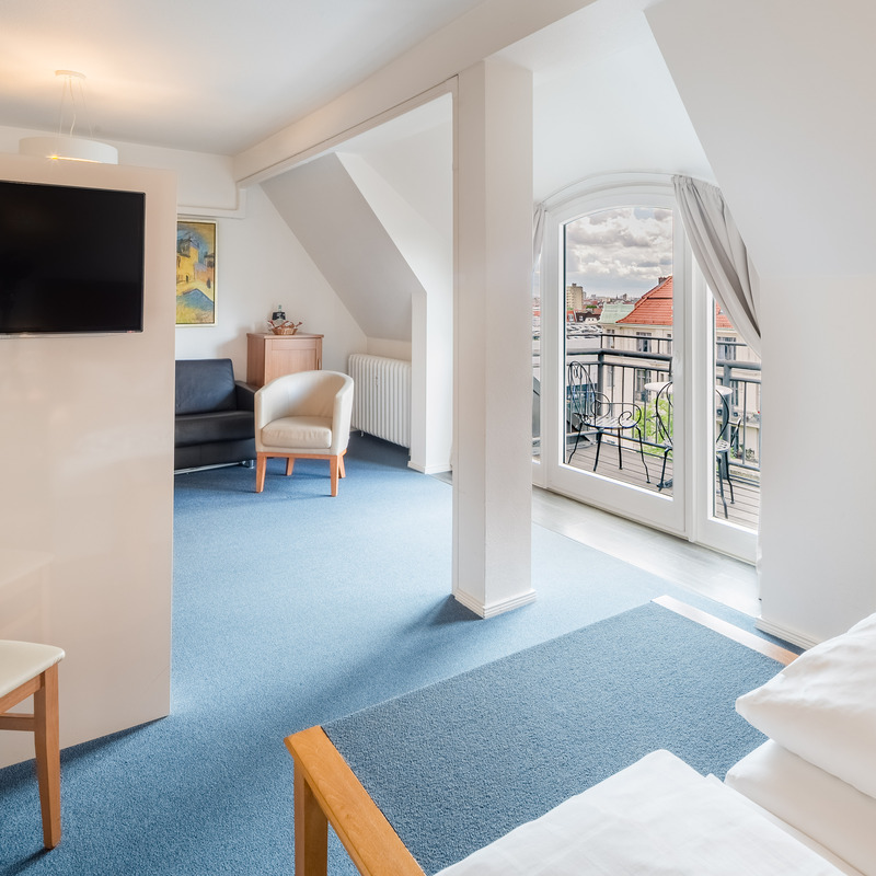 Die klimatisierte Suite ist mit einem gemütlichen Sitzbereich, einem offenen Schlafbereich, einem Schreibtisch, zwei TVs und einem großen Bad mit Dusche und zusätzlicher Badewanne ausgestattet. Der Südbalkon liegt zum Kaiserdamm.
