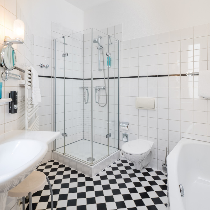 Das Komfort Zimmer ist ein kleines, ruhiges Zimmer mit einem 1,40m breiten Bett und einem großen Tageslichtbad.